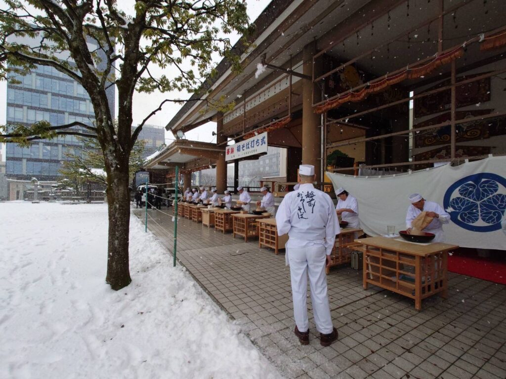 当日は神楽殿にて、そば打ち名人3名が